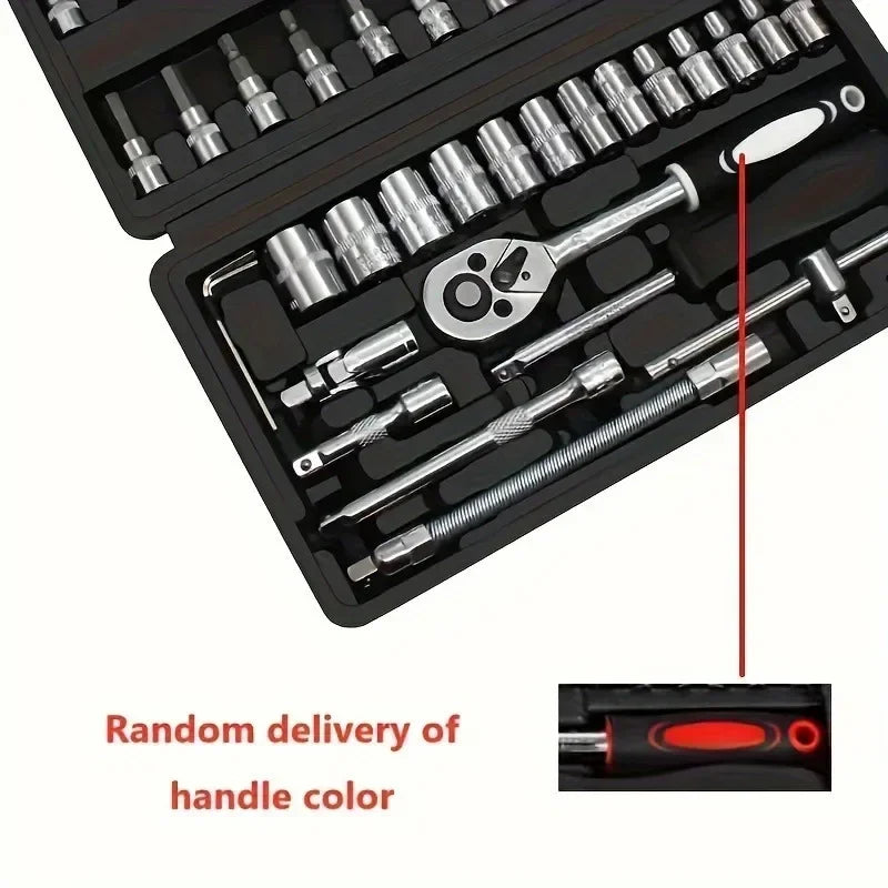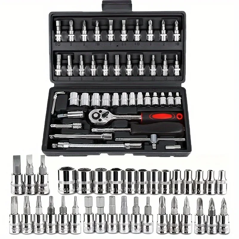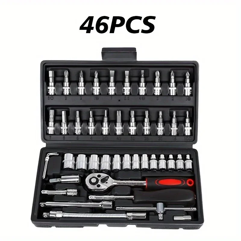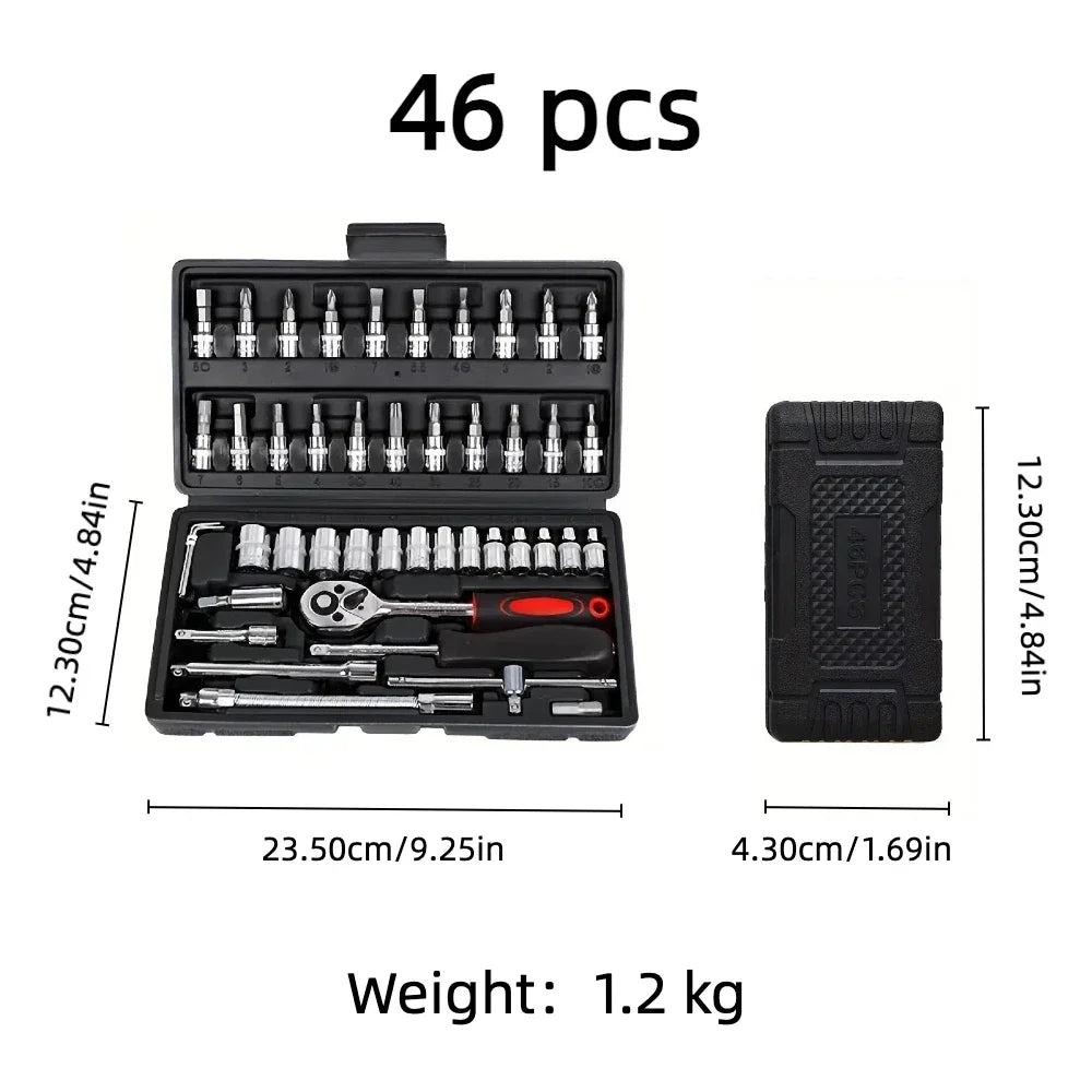 Set di attrezzi compatto da 46 pezzi, ideale per riparazioni auto e officine.